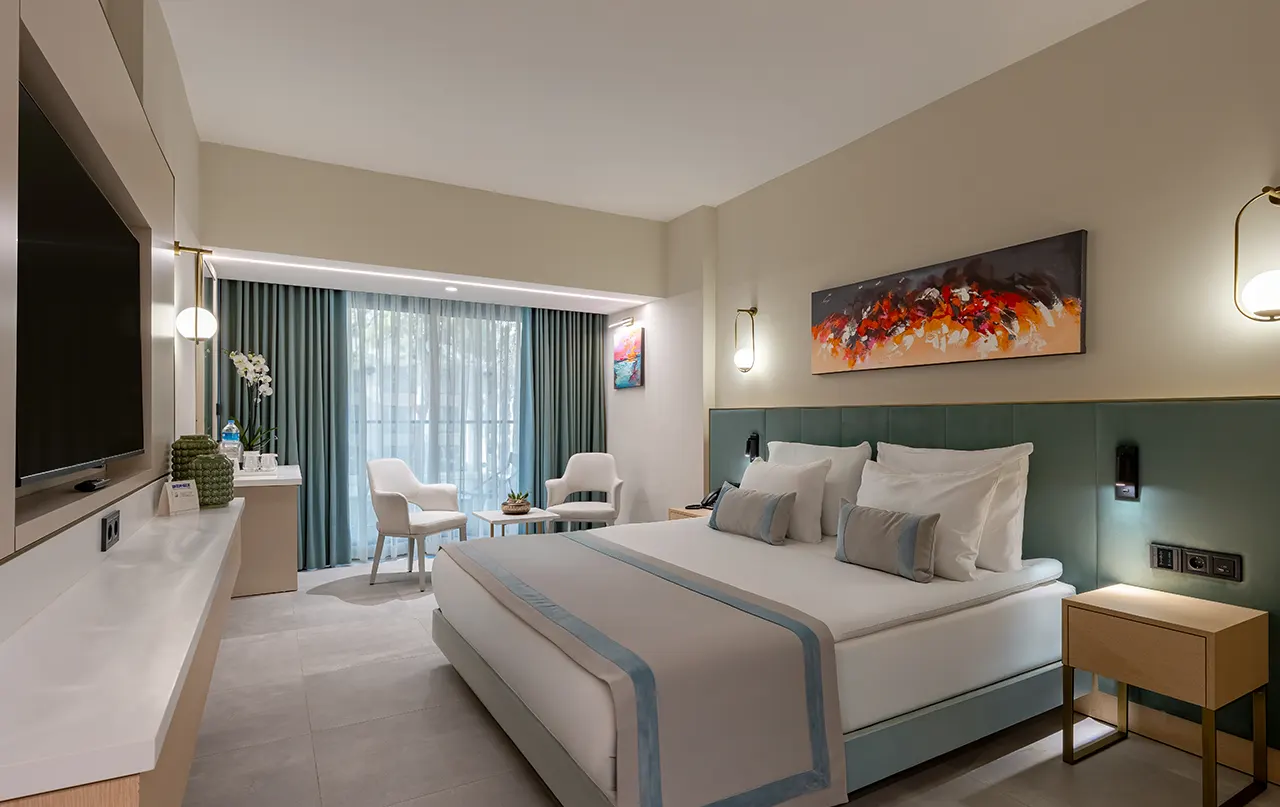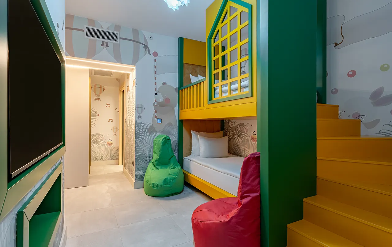 58 m² büyüklüğündeki bu odalar, 1 çift kişilik yatak bulunan bir yatak odası ve özel konsept ranzalı bir çocuk odasından oluşur. 2 WC, 2 duş kabinli banyo ve 1 balkonuyla misafirlere maksimum konfor sunar. Ana binada, iç bahçe manzarasına sahip olan odalarda arakapı bulunmaktadır. Minimum kapasitesi 2 yetişkin, maksimum kapasitesi ise 2 yetişkin + 2 çocuk olarak tasarlanmıştır. Aile tatilleriniz için huzur ve rahatlık bir arada!